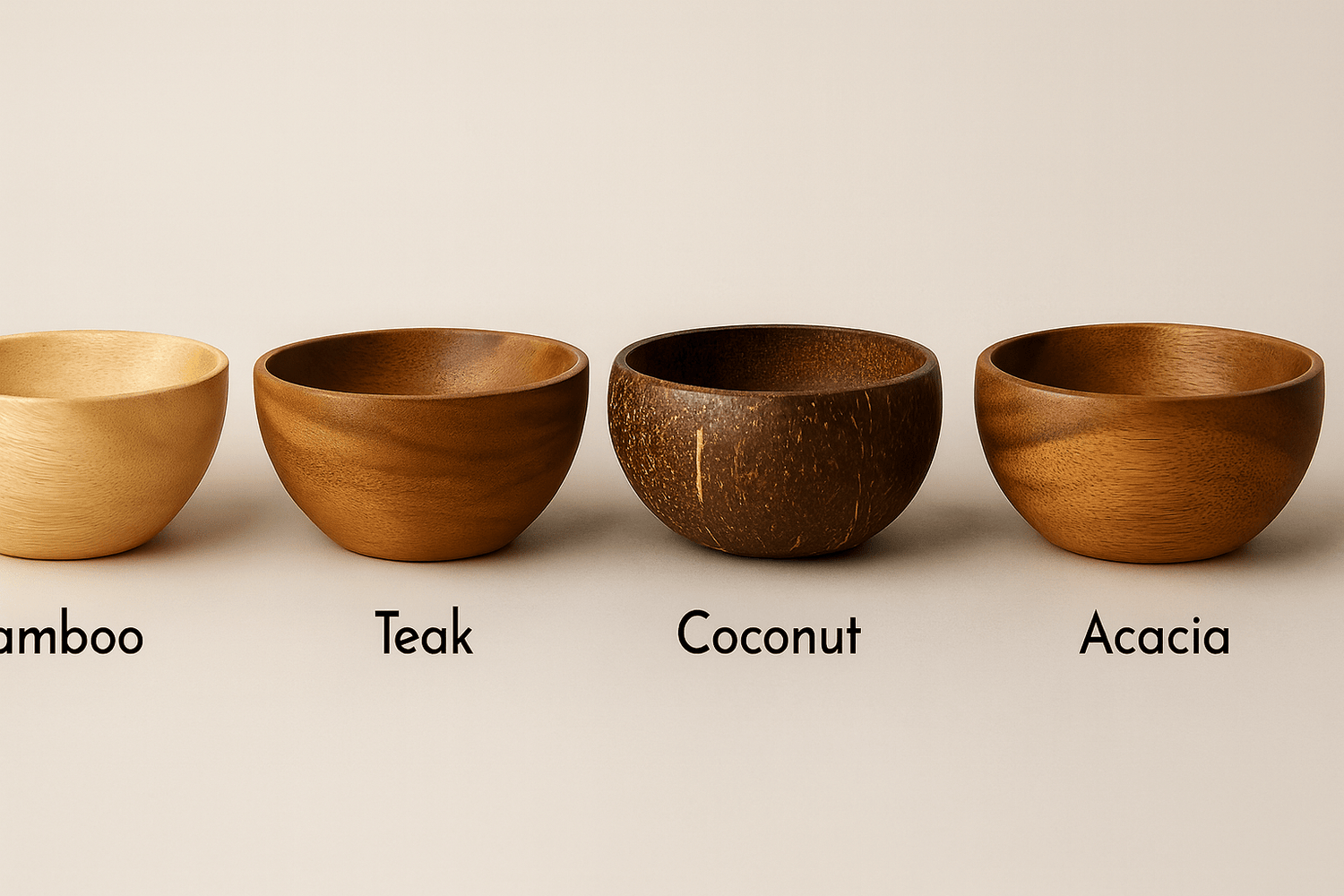 A natural collection of handcrafted wooden bowls made from bamboo, teak, coconut, and acacia. Each bowl highlights the unique texture and color of its wood, making them perfect for serving food or as decorative pieces. Durable, eco-friendly, and easy to maintain.