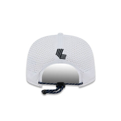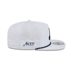 The 4Aces GC Performance Rope Golfer features an embroidered 4Aces GC logo at the front panels with breathable performance fabric throughout the cap. Additional details include a team patch at the right-wear side, an adjustable drawstring closure at the rear, and a blue undervisor.