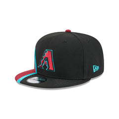 The Arizona Diamondbacks Corbin Carroll 9FIFTY Snapback features an embroidered Diamondbacks logo at the front panels with the player's name and number at the right-wear side. Additional details include a snapback closure at the rear and a gray undervisor.