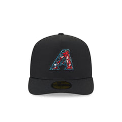 The Arizona Diamondbacks Stained Glass 59FIFTY A-Frame Fitted Cap features an embroidered Diamondbacks themed logo at the front with monochromatic team logo above a matching MLB Batterman logo at the rear, a pre-curved visor, and a gray undervisor.