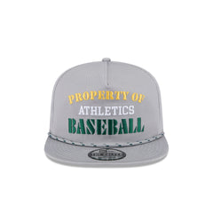 The Athletics Vintage Gray Golfer features an embroidered 'PROPERTY OF' Athletics wordmark at the front panels with a team logo at the right-wear side and a rope at the visor. Additional details include a snapback closure at the rear and a green undervisor.