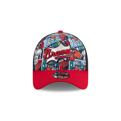 The Atlanta Braves Diamond Hero Edition 9FORTY A-Frame Snapback features an embroidered Braves onomatopoeia pop wordmark at the front panels with baseball comic book prints at the front and back panel. Additional details include a ZOOM! wordmark at the left-wear side, the MLB Batterman logo above a snapback closure at the rear, and a black undervisor.