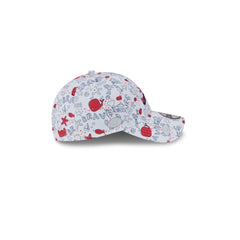The Atlanta Braves Kids Ocean 9TWENTY Adjustable Cap features an embroidered Braves logo at the front panels with a nautical design throughout the cap. Additional details include a stretch strap closure at the rear and a gray undervisor.