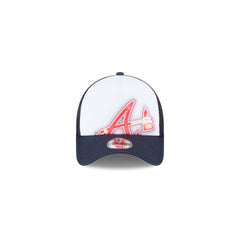 The Atlanta Braves Kids Painted 9FORTY A-Frame Trucker features a screen-printed Braves spray paint inspired logo at the front panels with a team tag on a snapback closure at a mesh rear.