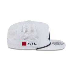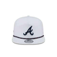 The Atlanta Braves Optic White Performance Rope Golfer features an embroidered Braves logo at the front panels with breathable performance fabric throughout the cap. Additional details include a city patch at the right-wear side, an adjustable drawstring closure at the rear, and a navy undervisor.