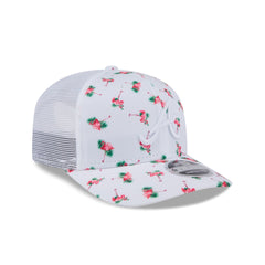 The Atlanta Braves Pattern 9SEVENTY Trucker Hat features an allover flamingo print with an embroidered Braves logo at the front panels with an adjustable snapback closure at a mesh rear.