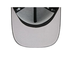 The Atlanta Braves Skeletal Script 9FIFTY A-Frame Snapback features a glow-in-the-dark embroidered Braves wordmark and skeleton hands at the front with an MLB Batterman logo at the right of a snapback closure at the rear and a gray undervisor.