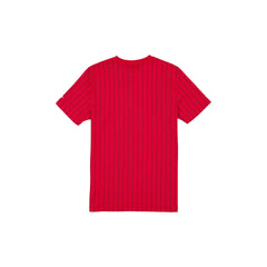 The Atlanta Braves Throwback Pinstripe T-Shirt features an embroidered Braves logo and wordmark at the front with a New Era jock tag at the left hip.