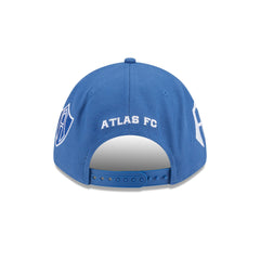 The Atlas FC Indigo 9FORTY M-Crown A-Frame Trucker features the Atlas primary logo embroidered at the front panel with alternate team logos throughout the crown, a team wordmark above a snapback closure at the rear, and a gray undervisor.