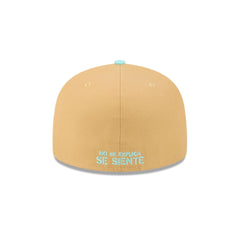 The Atlas FC Tan 59FIFTY Fitted Cap features an embroidered Atlas logo at the front panels with a matching team wordmark at the rear and a color block crown. Additional details include a brown corduroy visor with a blue undervisor.