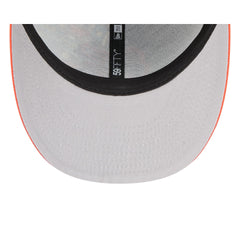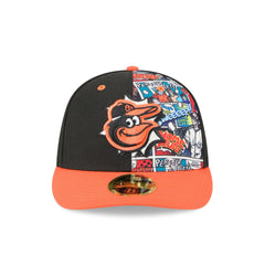 The Baltimore Orioles Diamond Hero Edition Low Profile 59FIFTY Fitted Cap features an embroidered Orioles onomatopoeia pop logo at the front panels with baseball comic book prints at the front and back panel. Additional details include the MLB Batterman logo at the rear and a gray undervisor. This cap comes with a pre-curved visor.