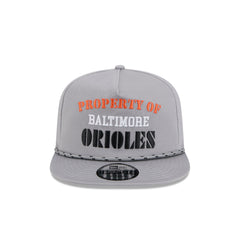 The Baltimore Orioles Vintage Gray Golfer features an embroidered 'PROPERTY OF' Orioles wordmark at the front panels with a team logo at the right-wear side and a rope at the visor. Additional details include a snapback closure at the rear and a green undervisor.