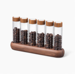 This elegant coffee bean display rack is designed for coffee lovers who want to showcase and preserve their collection in style. Featuring eight glass storage tubes with professional-grade one-way valves, it helps maintain freshness by allowing gases to escape while blocking oxygen. The solid wood frame, paired with durable glass and ABS/PE components, makes it both functional and visually striking — a practical storage solution and a decorative piece for any coffee corner.