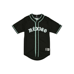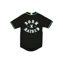 The Born x Raised x Diablos Rojos del México Black Jersey features an embroidered Diablos Rojos México applique wordmark at the chest with a New Era Official Merchandise patch at the left hip, and a Born x Raised wordmark and LMB logo at the rear.