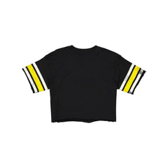 The Boston Bruins Throwback Cropped Women's T-Shirt features a screen-printed Bruins graphic at the front with a New Era jock tag at the left hip. This shirt has a cropped fit.