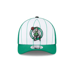 The Boston Celtics 2025 Tip-Off 9FORTY M-Crown A-Frame Snapback features an embroidered Celtics logo at the front panels against a pinstripe jersey fabrication with the NBA Logoman at the right-wear side. Additional details include an adjustable snapback closure at the rear and a gray undervisor.