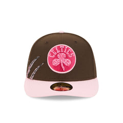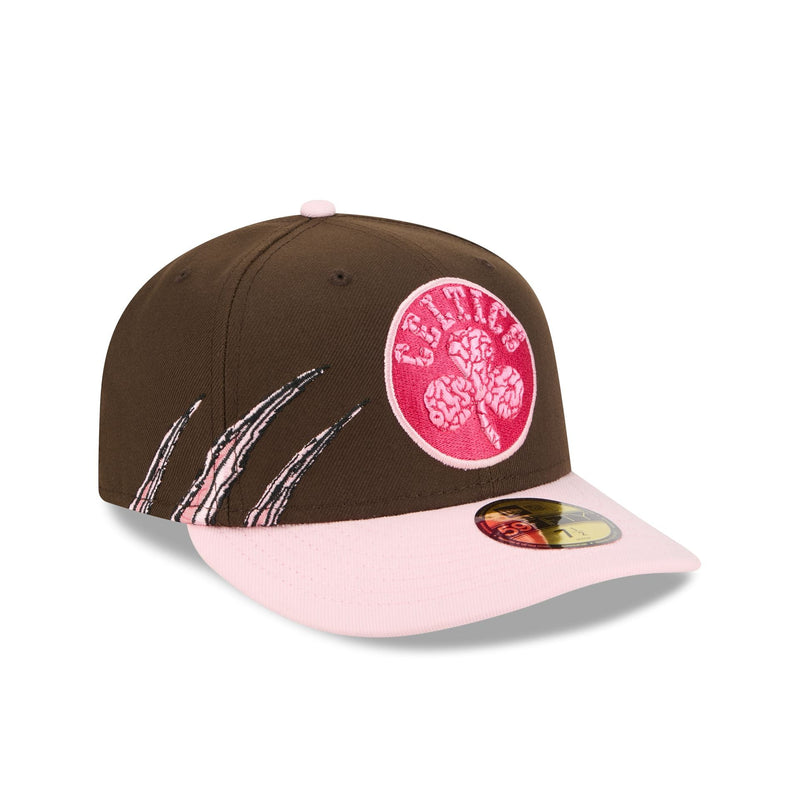 The Boston Celtics Brains 59FIFTY Fitted Cap features an embroidered brain themed Celtics logo at the front panels with a matching NBA Logoman at the rear. Additional details include scratch details at the right-wear side with a light pink visor and a gray undervisor. This cap comes with a pre-curved visor.