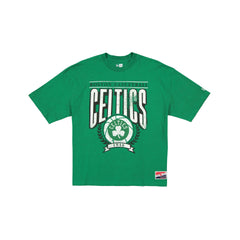The Boston Celtics Throwback Boxy T-Shirt features a screen-printed Celtics graphic at the front and a New Era jock tag at the left hip.