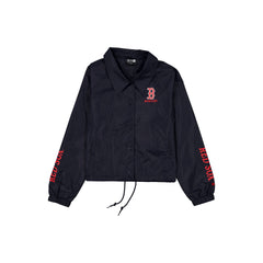 The Boston Red Sox Game Day Women's Jacket features a screen-printed Red Sox logo at the left chest with a wordmark at each sleeve. Additional details include a button closure, pockets, and adjustable drawstrings at the waist.