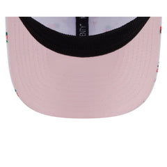 The Boston Red Sox Pattern 9SEVENTY Trucker Hat features an allover flamingo print with an embroidered Red Sox logo at the front panels with an adjustable snapback closure at a mesh rear.