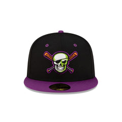 The Bradenton Marauders Halloween Purple 59FIFTY Fitted Cap features an embroidered Marauders themed logo at the front panels with a matching MiLB Batterman logo at the rear, a purple visor, and a green undervisor.