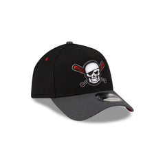 The Bradenton Marauders Halloween Red 9FORTY A-Frame Snapback features an embroidered Marauders themed logo at the front panels with an adjustable snapback closure at the rear, a gray visor, and a red undervisor.