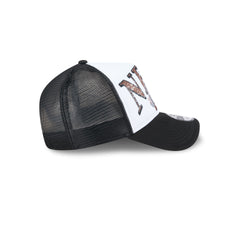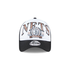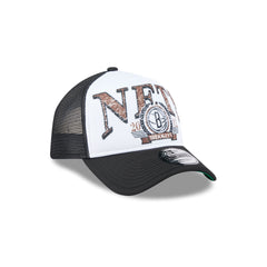 The Brooklyn Nets Distressed 9FORTY A-Frame Trucker features a distressed screen-printed Nets wordmark and logo at the front panels with a team tag at a snapback closure at the rear and a green undervisor.