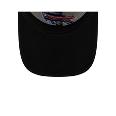 The Buffalo Bills Josh Allen 2024 MVP Black 9FORTY Adjustable Cap features an embroidered Bills logo at the front panels with a 2024 MVP 17 Josh Allen embroidery at the right-wear side and an adjustable hook-and-loop strap closure at the rear.