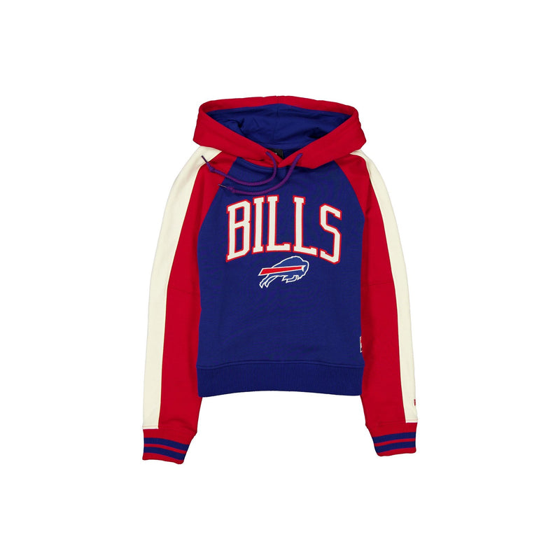 The Buffalo Bills Throwback Women's Hoodie features a twill applique Bills wordmark above an embroidered team logo at the front. Additional details include adjustable drawstrings at the hood and a New Era jock tag at the left hip.
