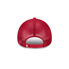 The Calgary Flames Distressed 9FORTY A-Frame Trucker features a distressed screen-printed Flames wordmark and logo at the front panels with a team tag at a snapback closure at the rear and a green undervisor.