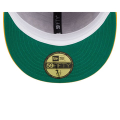 The Calgary Flames Spring Satin 59FIFTY Fitted Cap features an embroidered Flames wordmark at the front panels with a New Era pin at the top left panel and an NHL Shield logo at the rear. Additional details include a satin fabrication throughout, a logo at the right-wear side, and a green undervisor.