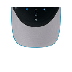 The Carolina Panthers Team 9FORTY M-Crown Snapback features an embroidered Panthers logo at the front panels with a matching NFL Shield logo above an adjustable snapback closure at the rear and a gray undervisor.