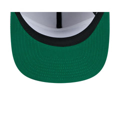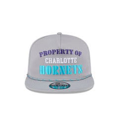 The Charlotte Hornets Vintage Gray Golfer features an embroidered 'PROPERTY OF' Hornets wordmark at the front panels with a team logo at the right-wear side and a rope at the visor. Additional details include a snapback closure at the rear and a green undervisor.