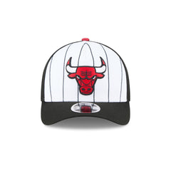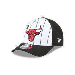 The Chicago Bulls 2025 Tip-Off 9FORTY M-Crown A-Frame Snapback features an embroidered Bulls logo at the front panels against a pinstripe jersey fabrication with the NBA Logoman at the right-wear side. Additional details include an adjustable snapback closure at the rear and a gray undervisor.
