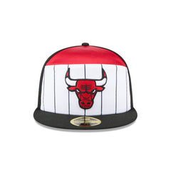 The Chicago Bulls 2025 Tip-Off Split Panel 59FIFTY Fitted Cap features an embroidered Bulls logo at the front panels against a pinstripe jersey fabrication with the NBA Logoman at the right-wear side. Additional details include a team wordmark at the rear and a gray undervisor.