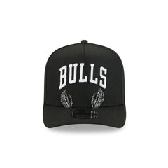 The Chicago Bulls Skeletal Script 9FIFTY A-Frame Snapback features a glow-in-the-dark embroidered Bulls wordmark and skeleton hands at the front with an NBA Logoman at the right of a snapback closure at the rear and a gray undervisor.