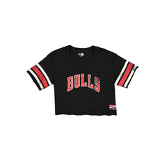 The Chicago Bulls Throwback Cropped Women's T-Shirt features a screen-printed Bulls graphic at the front with a New Era jock tag at the left hip. This shirt has a cropped fit.