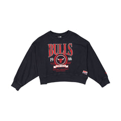 The Chicago Bulls Throwback Women's Crewneck features a screen-printed Bulls graphic at the front and a New Era jock tag at the left hip.