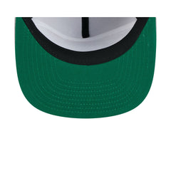 The Chicago Bulls Vintage Gray Golfer features an embroidered 'PROPERTY OF' Bulls wordmark at the front panels with a team logo at the right-wear side and a rope at the visor. Additional details include a snapback closure at the rear and a green undervisor.