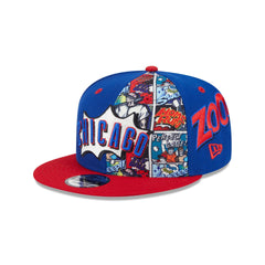 The Chicago Cubs Diamond Hero Edition 9FIFTY Snapback features an embroidered Cubs onomatopoeia pop wordmark at the front panels with baseball comic book prints at the front and back panel. Additional details include a ZOOM! wordmark at the left-wear side, the MLB Batterman logo above a snapback closure at the rear, and a gray undervisor.