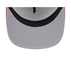 The Chicago Cubs Retro Script 9FIFTY A-Frame Trucker features a distressed screen-printed Cubs script wordmark and team logo at the front panels with a snapback closure at a mesh rear and a gray undervisor.