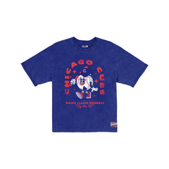 The Chicago Cubs Throwback Character Women's T-Shirt features a screen-printed Cubs baseball character at the front with a New Era Jock tag at the left hip.