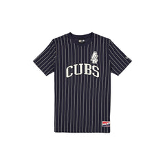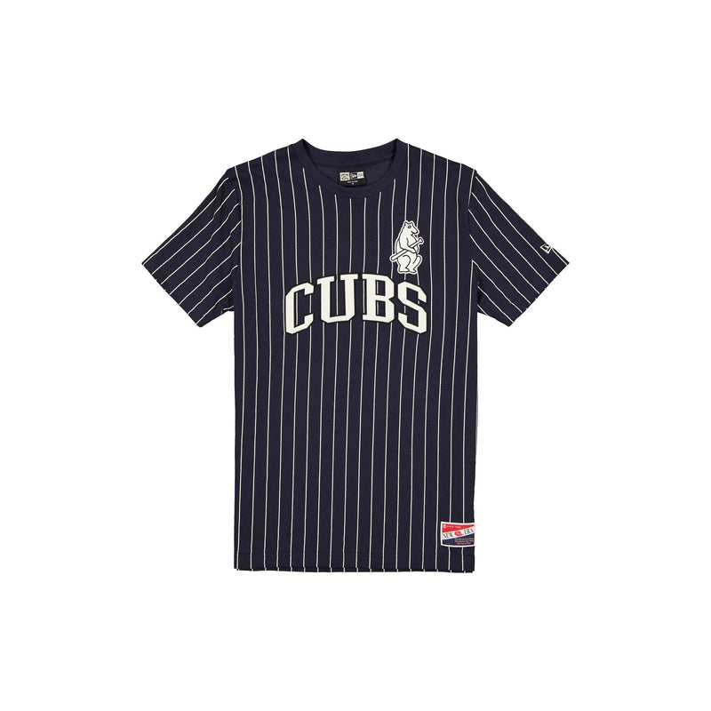The Chicago Cubs Throwback Pinstripe Wordmark T-Shirt features a twill applique Cubs wordmark and Cooperstown logo at the front with a New Era jock tag at the left hip.