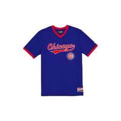 The Chicago Cubs Throwback Team T-Shirt features a screen-printed Cubs wordmark and embroidered team logo at the front with a New Era jock tag at the left hip. This t-shirt has a v-neckline.