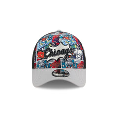 The Chicago White Sox Diamond Hero Edition 9FORTY A-Frame Snapback features an embroidered White Sox onomatopoeia pop wordmark at the front panels with baseball comic book prints at the front and back panel. Additional details include a ZOOM! wordmark at the left-wear side, the MLB Batterman logo above a snapback closure at the rear, and a black undervisor.