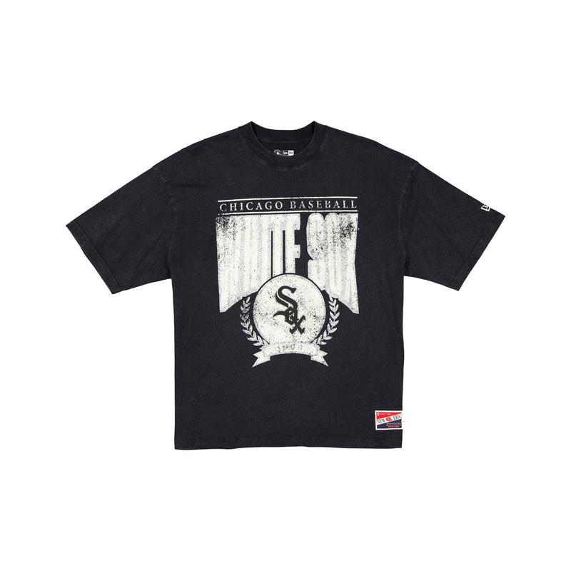The Chicago White Sox Throwback Boxy T-Shirt features a screen-printed White Sox graphic at the front and a New Era jock tag at the left hip.