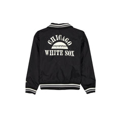 The Chicago White Sox Throwback Women's Jacket features an embroidered White Sox logo at the left chest with a screen-printed wordmark at the rear. Additional details include front pockets, a button closure, and a New Era jock tag at the left hip.