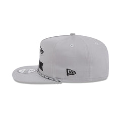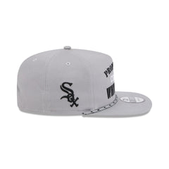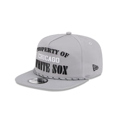 The Chicago White Sox Vintage Gray Golfer features an embroidered 'PROPERTY OF' White Sox wordmark at the front panels with a team logo at the right-wear side and a rope at the visor. Additional details include a snapback closure at the rear and a green undervisor.