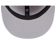 The Cincinnati Reds Pinstripe League Pin 59FIFTY Fitted Cap features an embroidered Reds logo at the front panels with a League pin at the front right panel. Additional details include pinstripes, a matching MLB Batterman logo at the rear, and a gray undervisor.