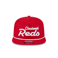 The Cincinnati Reds Team Text Golfer features an embroidered Reds script at the front panels with a team logo at the right-wear side and a snapback closure at the rear.